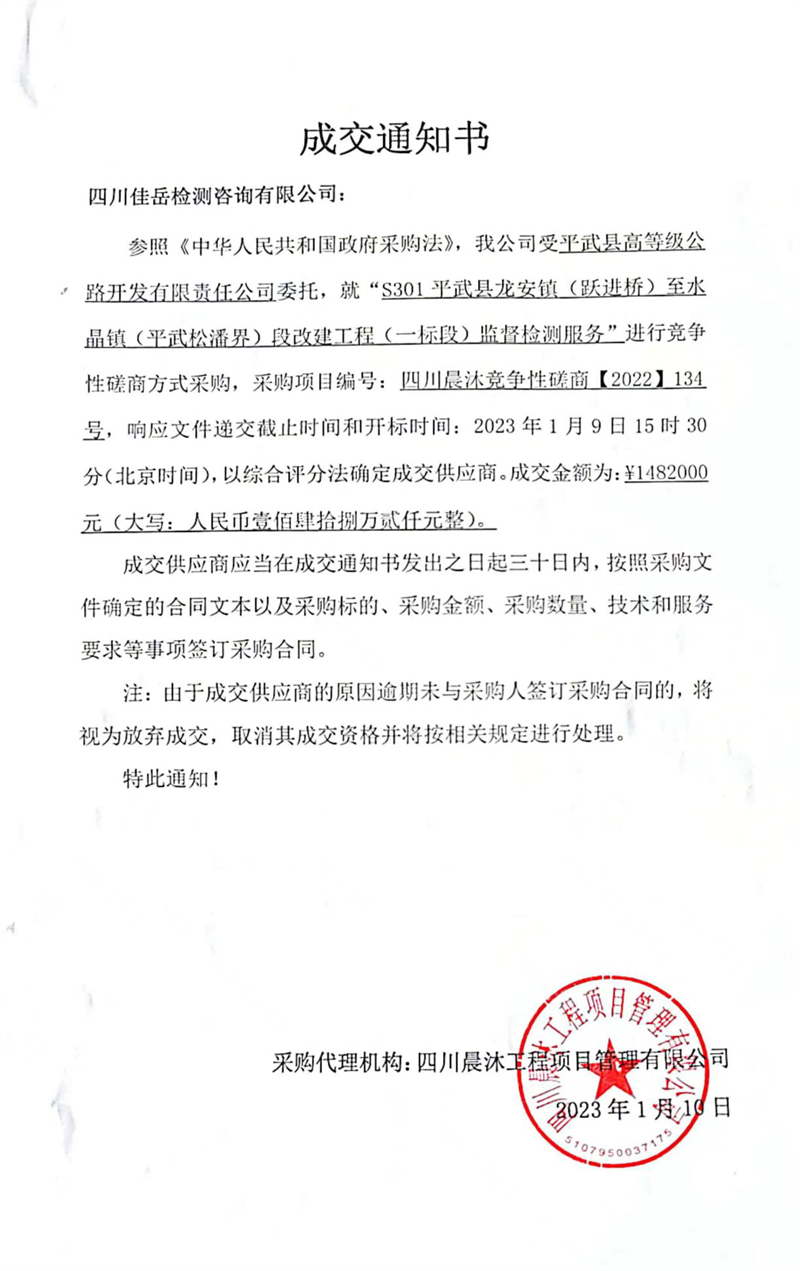 中标项目为S301平武县龙安镇(跃进桥)至水晶镇(平武松潘界)段改建工程(一标段)监督检测服务项目,成交金额148万余元。此次成功中标展示了公司的检测能力和市场竞争力,为公司“走出去”持续承揽市外、省外业务增添信心。