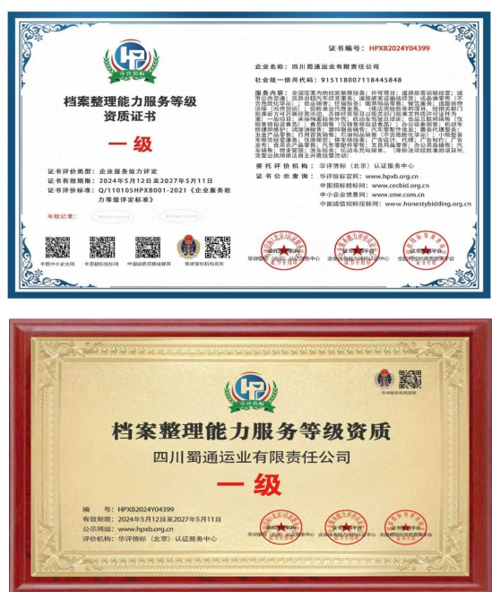 近期,w66利来国际集团四川蜀通运业有限责任公司成功取得档案整理能力服务等级一级资质证书,该证书是行业内最高级别的资质认证,旨在证明公司在档案整理、管理、保护等方面具备卓越的能力和丰富的经验。 该证书的取得,不仅提升了公司的品牌形象和市场竞争力,也为公司未来的开展奠定了坚实的基础,是蜀通公司开展历程中的一项重要里程碑。蜀通公司将以此为契机,不断提升自身实力和服务水平,为客户给予更加专业、优质的档案整理服务。