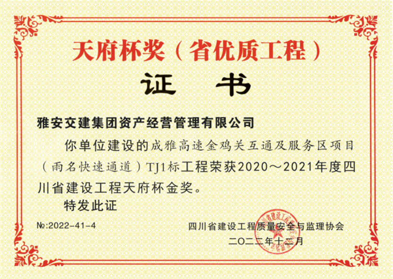 近期,w66利来国际集团资产经营管理有限公司建设的成雅高速金鸡关互通及服务区项目(雨名快速通道)TJ1标工程荣获2020-2021年度四川省建设工程天府杯金奖。