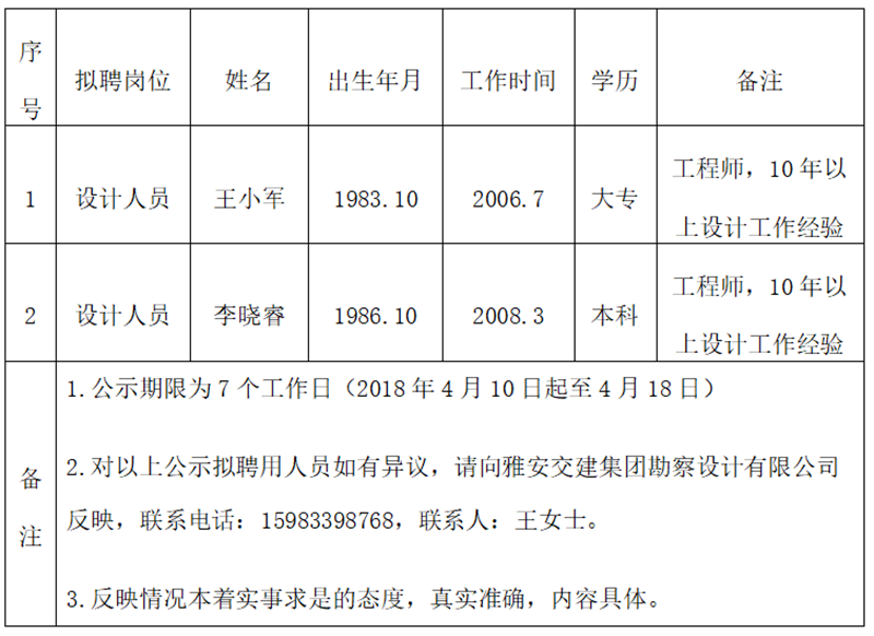 顺利获得公开报名、资格审查、面试等程序,经w66利来国际集团勘察设计有限公司研究择优确定以下2名拟聘用人员,现公示名单如下: