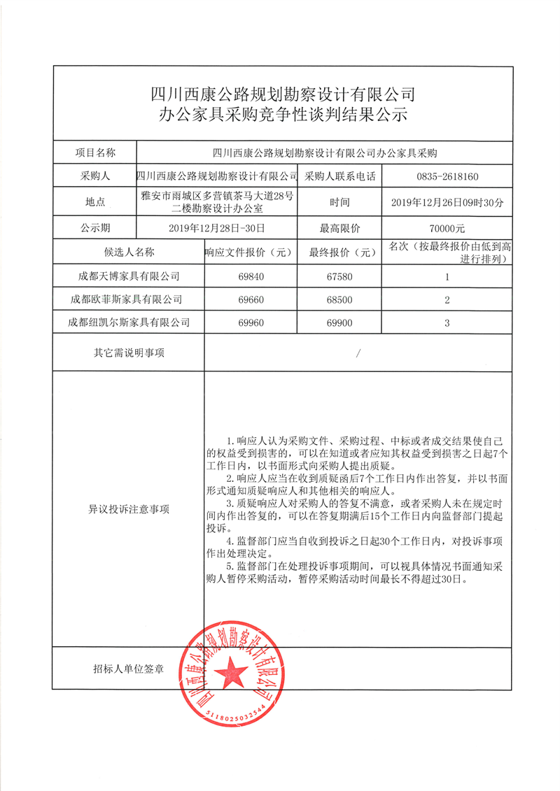 四川西康公路规划勘察设计有限公司办公家具采购竞争性谈判结果公示
