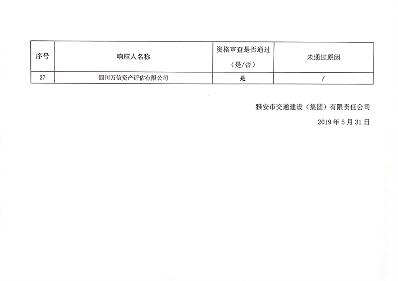 雅安交通建设(集团)有限责任公司资产评估服务企业入库比选结果