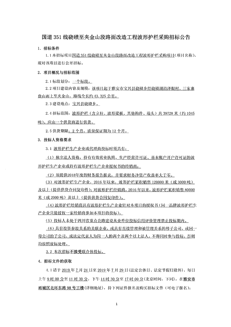 w66利来国际集团路桥有限责任公司国道351线硗碛至夹金山段路面改造工程波形护栏采购招标公告