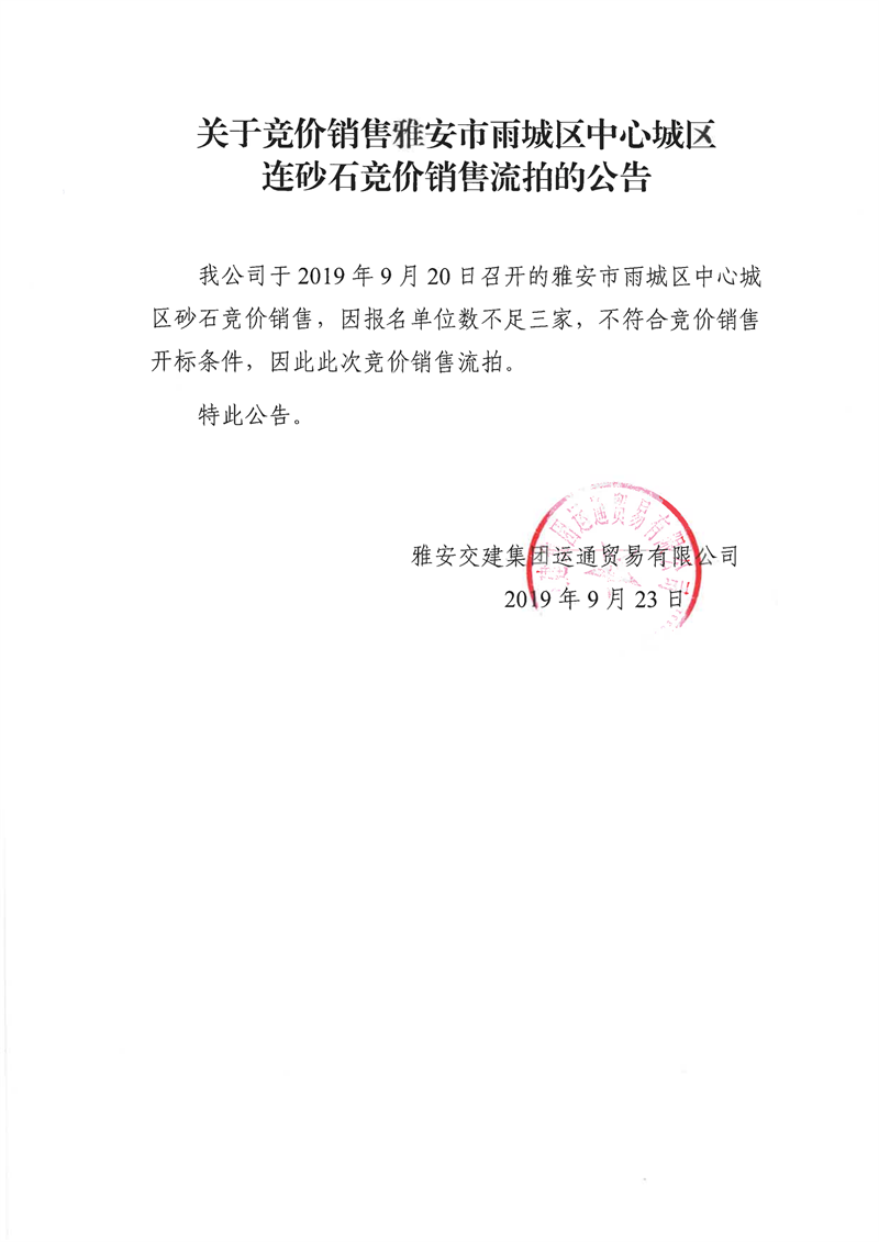 w66利来国际集团运通贸易有限公司关于竞价销售雅安市雨城区中心城区连砂石竞价销售流拍的公告