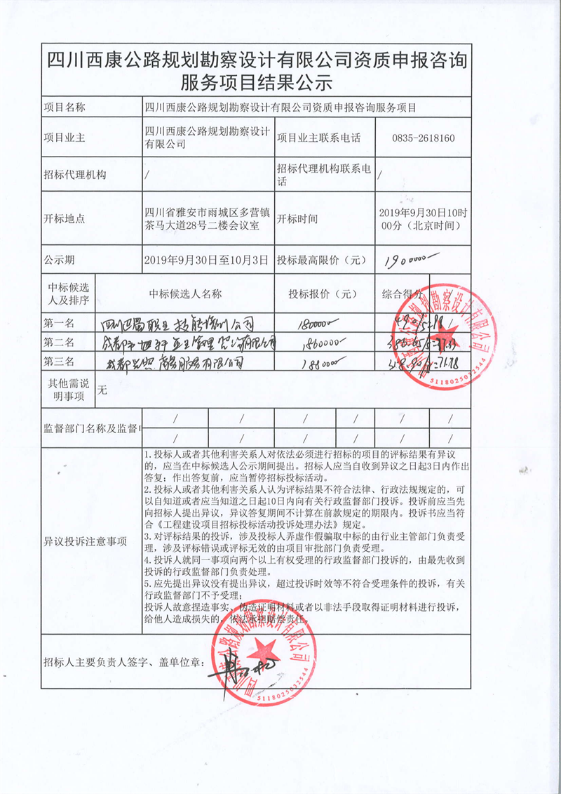 四川西康公路规划勘察设计有限公司资质申报咨询服务项目结果公示