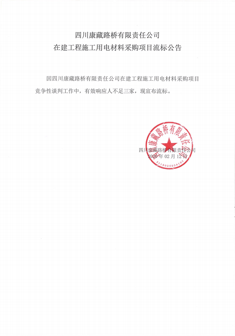 四川康藏路桥有限责任公司在建工程施工用电材料采购项目流标公告