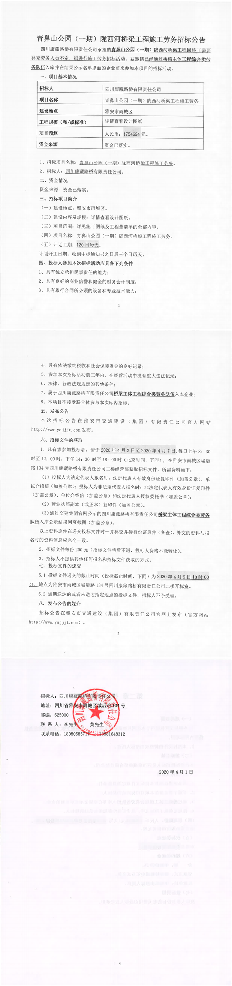 四川康藏路桥有限责任公司青鼻山公园(一期)陇西河桥梁工程施工劳务招标公告