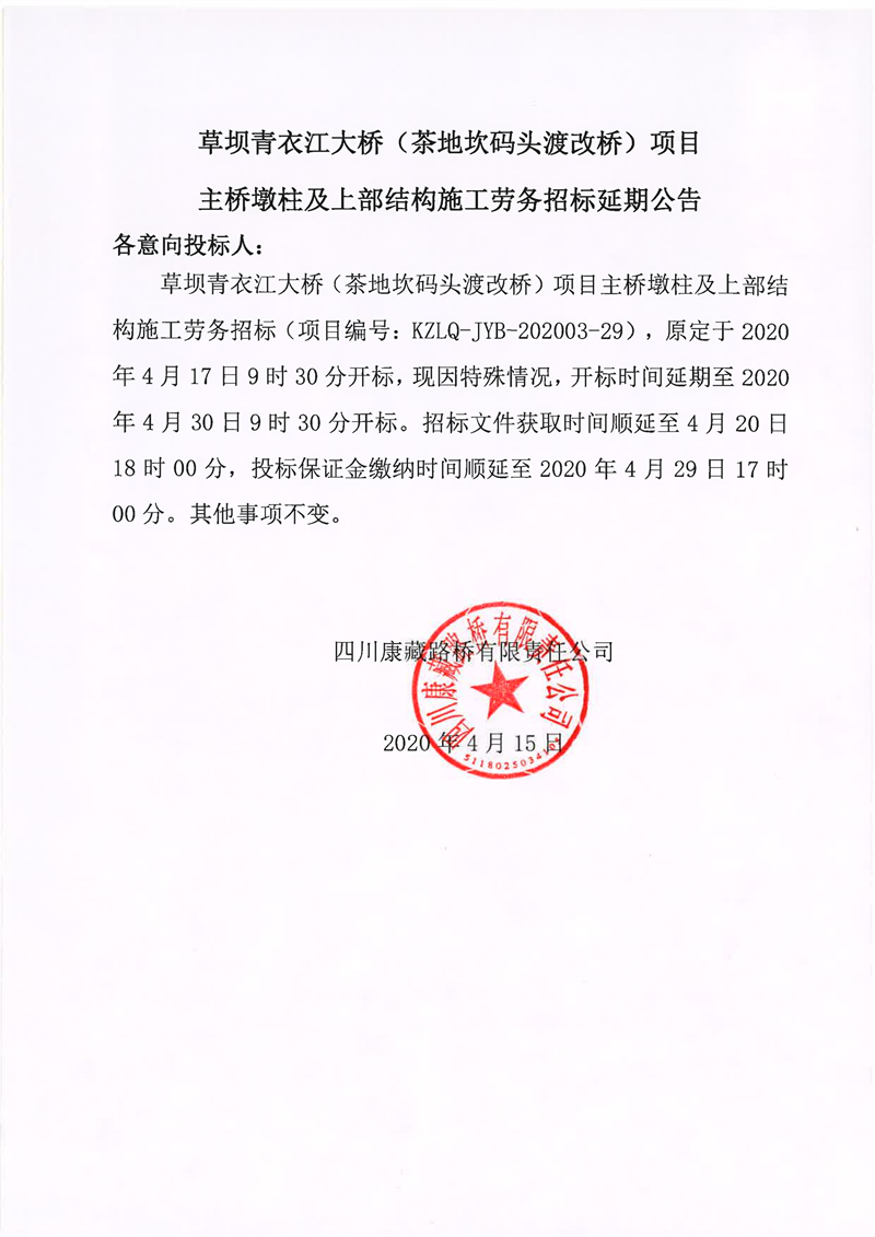 四川康藏路桥有限责任公司草坝青衣江大桥(茶地坎码头渡改桥)项目主桥墩柱及上部结构施工劳务招标延期公告