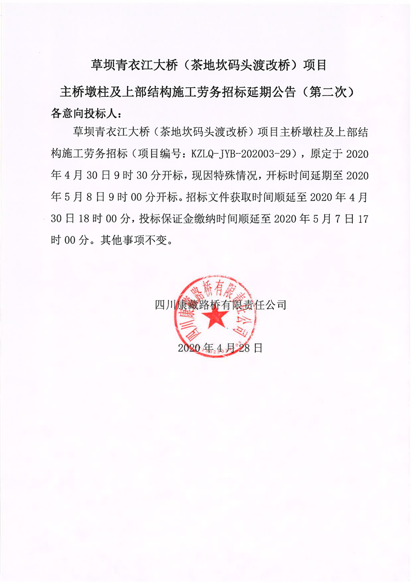 四川康藏路桥有限责任公司草坝青衣江大桥(茶地坎码头渡改桥)项目主桥墩柱及上部结构施工劳务招标延期公告(第二次)