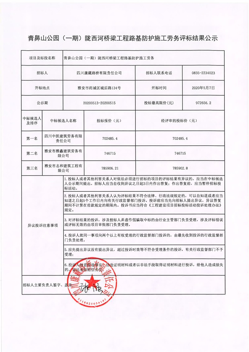 四川康藏路桥有限责任公司青鼻山公园(一期)陇西河桥梁工程路基防护施工劳务评标结果公示