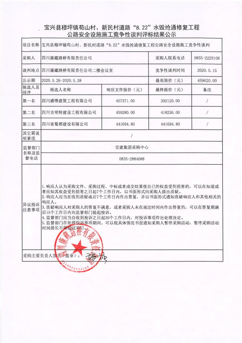 四川康藏路桥有限责任公司宝兴县穆坪镇苟山村、新民村道路“8.22”水毁抢通修复工程公路安全设施施工竞争性谈判评标结果公示