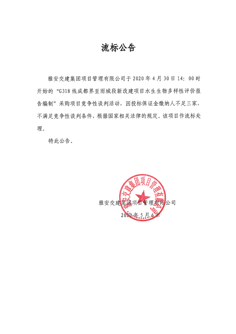 w66利来国际集团项目管理有限公司G318线成都界至雨城段新改建项目水生生物多样性评价报告编制流标公告