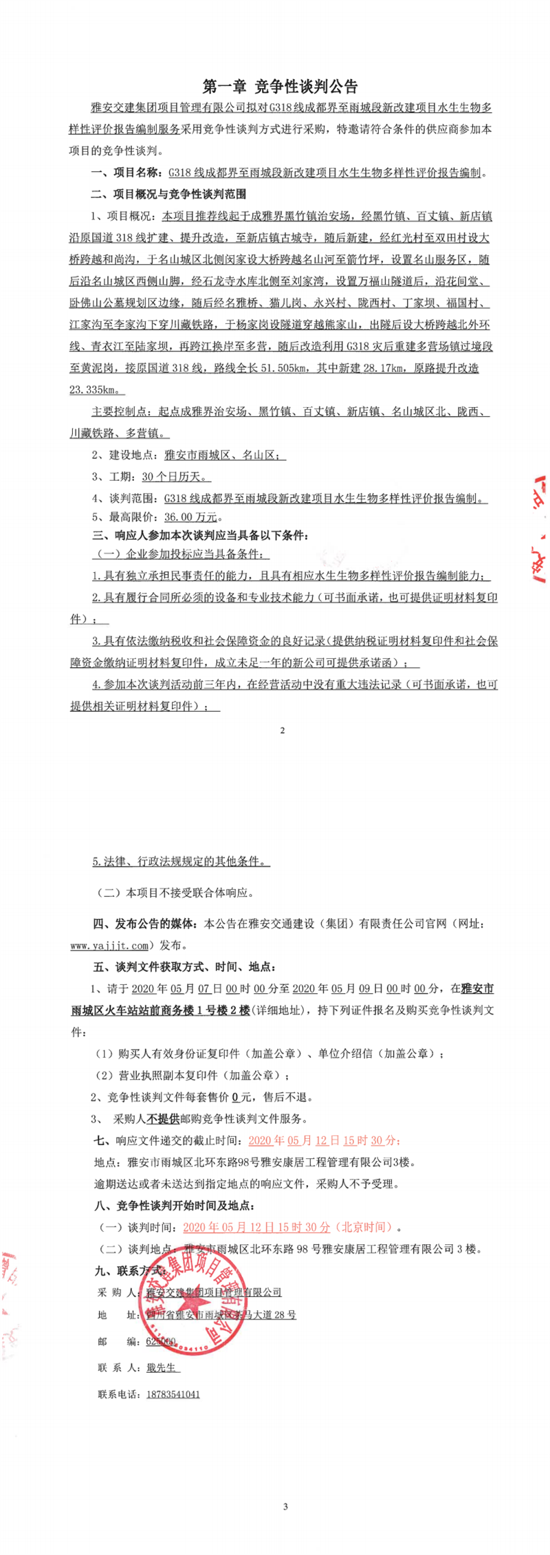 w66利来国际集团项目管理有限公司G318线成都界至雨城段新改建项目水生生物多样性评价报告编制竞争性谈判(第二次)公告