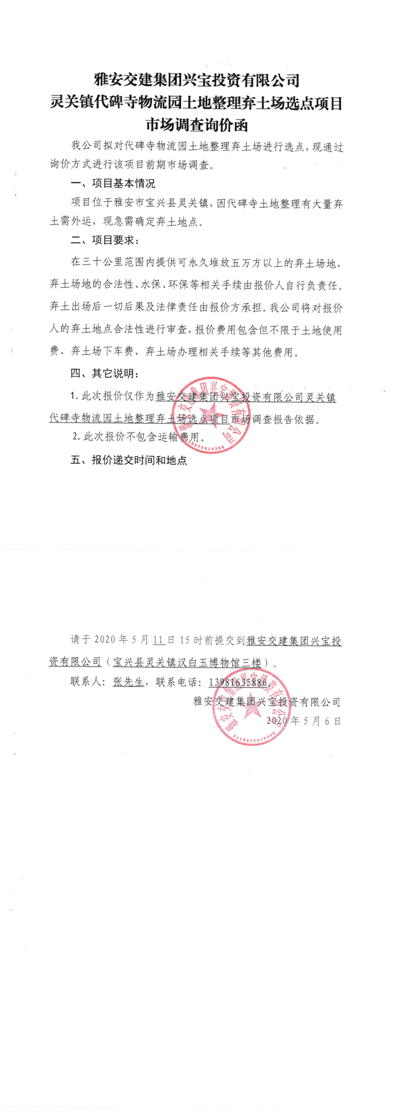 w66利来国际集团兴宝投资有限公司灵关镇代碑寺物流园土地整理弃土场选点项目市场调查询价函