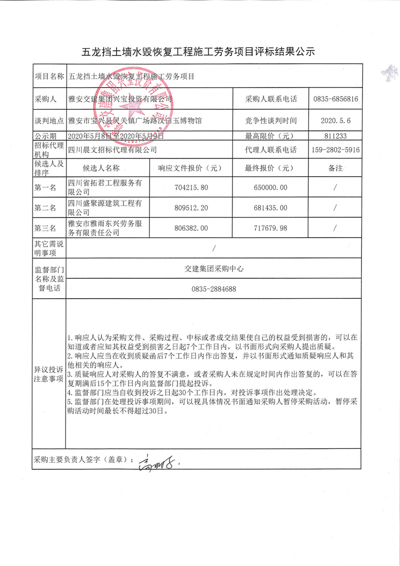 w66利来国际集团兴宝投资有限公司五龙挡土墙水毁恢复工程施工劳务项目评标结果公示