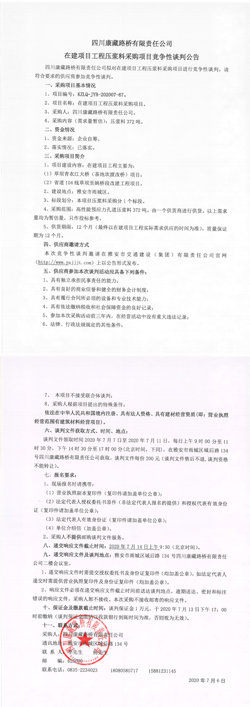 四川康藏路桥有限责任公司在建项目工程压浆料采购项目竞争性谈判公告