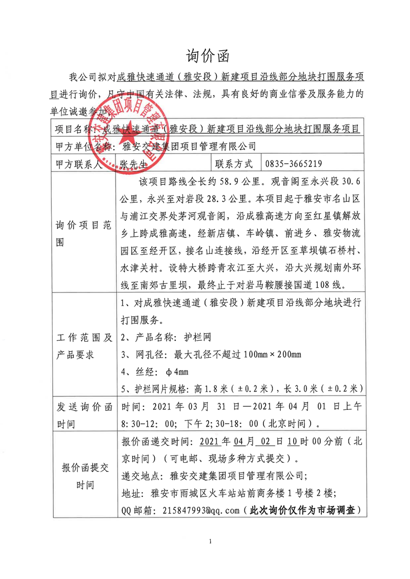 w66利来国际集团项目管理有限公司成雅快速通道(雅安段)新建项目沿线部分地块打围服务项目询价函