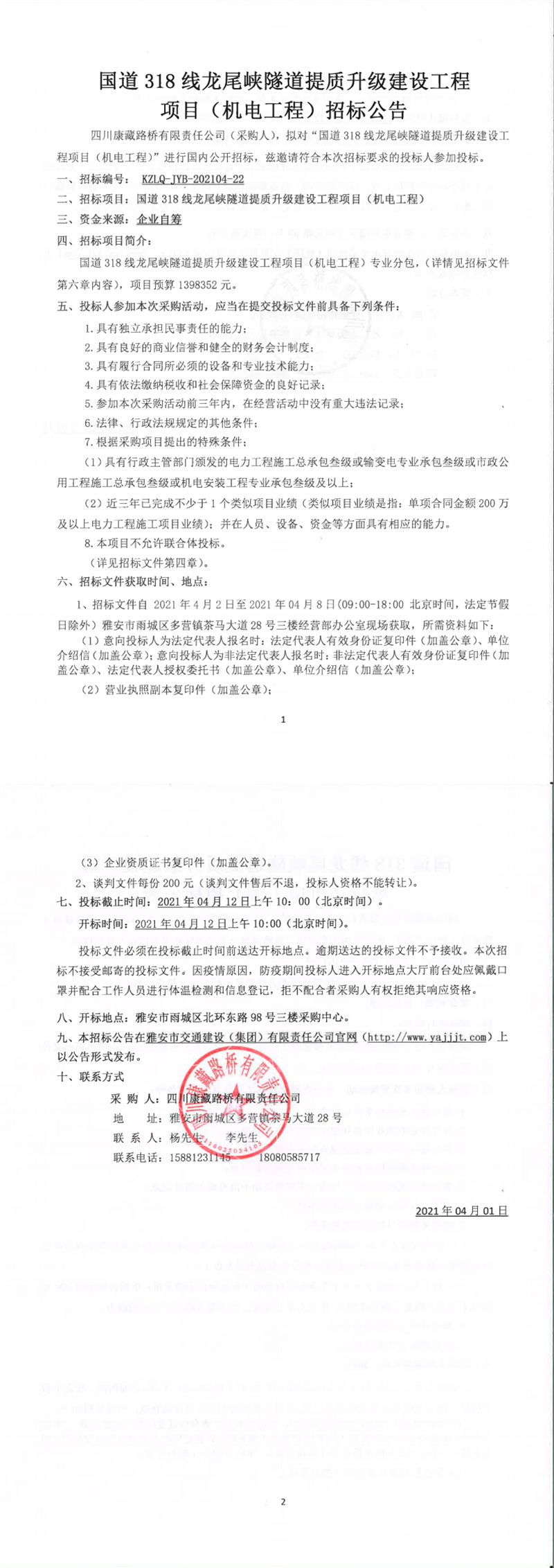 四川康藏路桥有限责任公司国道318线龙尾峡隧道提质升级建设工程项目(机电工程)招标公告