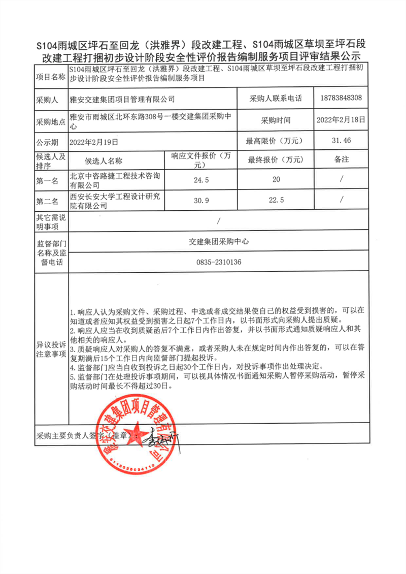w66利来国际集团项目管理有限公司S104雨城区坪石至回龙(洪雅界)段改建工程、S104雨城区草坝至坪石段改建工程打捆初步设计阶段安全性评价报告编制服务项目评审结果公示