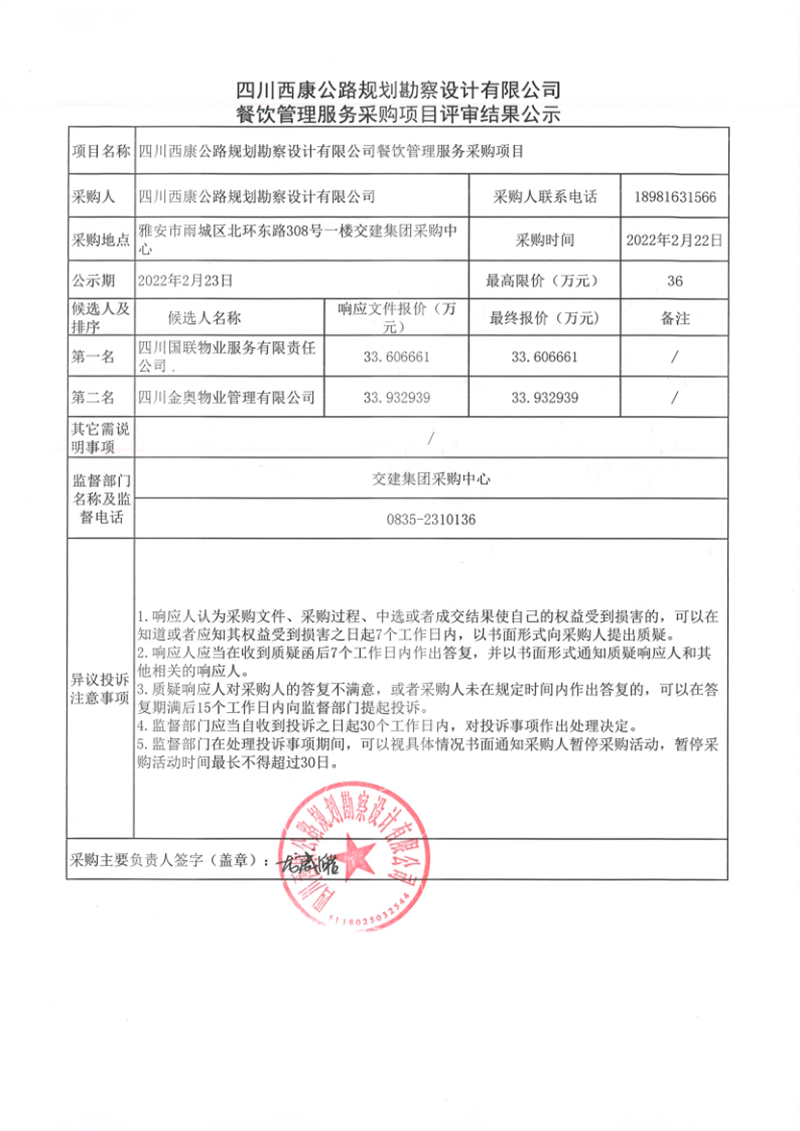 四川西康公路规划勘察设计有限公司餐饮管理服务采购项目评审结果公示