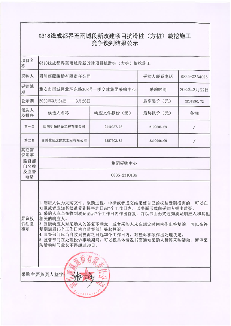 四川康藏路桥有限责任公司G318线成都界至雨城段新改建项目抗滑桩(方桩)旋挖施工竞争谈判结果公示