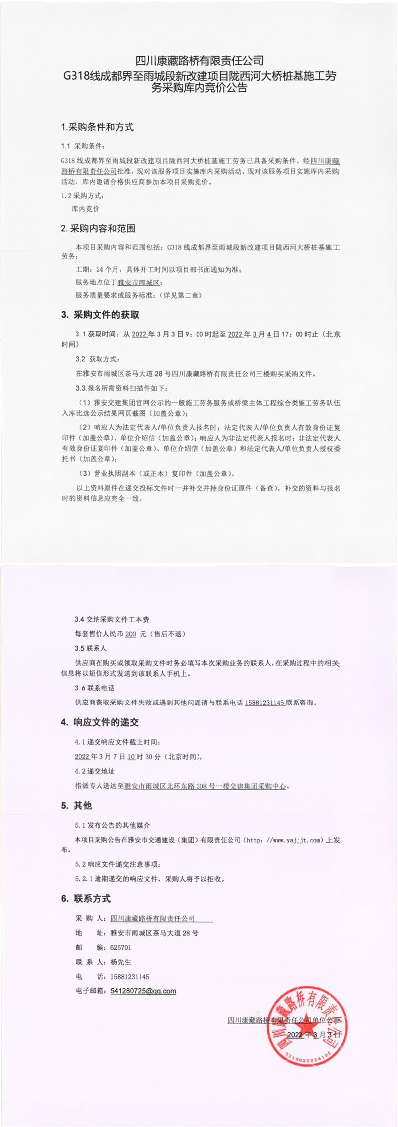 四川康藏路桥有限责任公司G318线成都界至雨城段新改建项目名山河大桥桩基施工劳务采购库内竞价公告