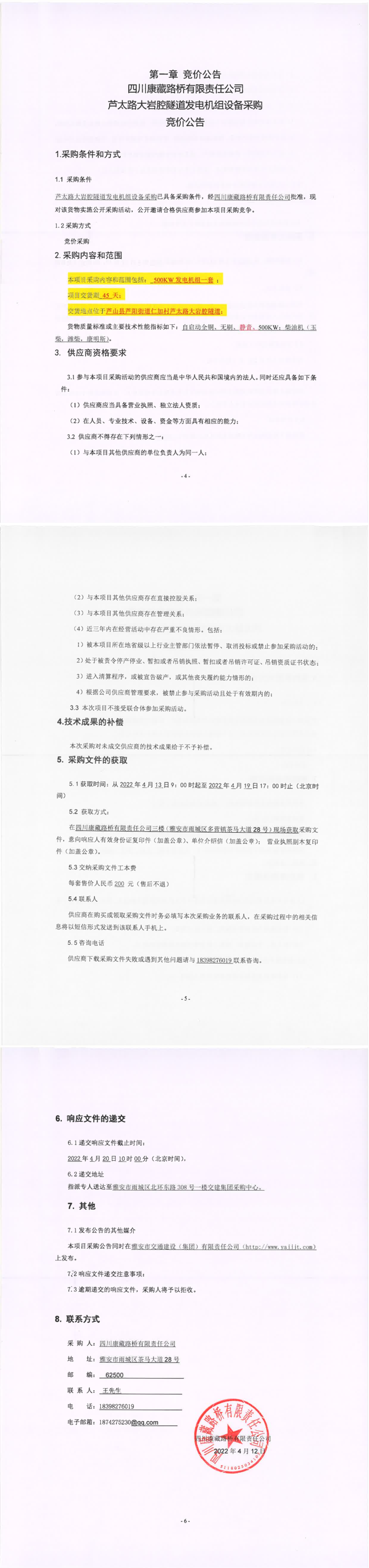 四川康藏路桥有限责任公司芦太路大岩腔隧道发电机组设备采购竞价公告