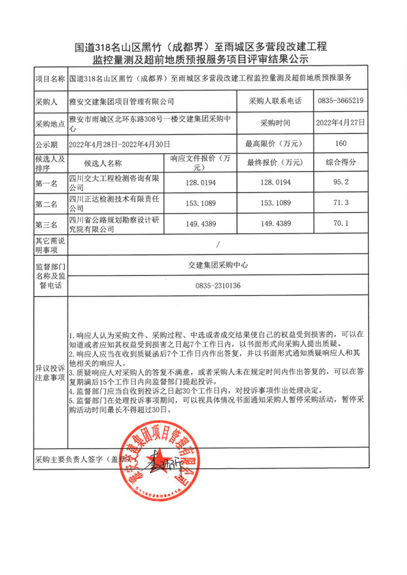 w66利来国际集团项目管理有限公司国道318名山区黑竹(成都界)至雨城区多营段改建工程监控量测及超前地质预报服务项目评审结果公示
