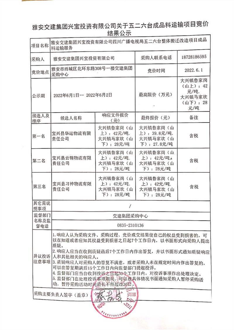 w66利来国际集团兴宝投资有限公司关于五二六台成品料运输项目竞价结果公示