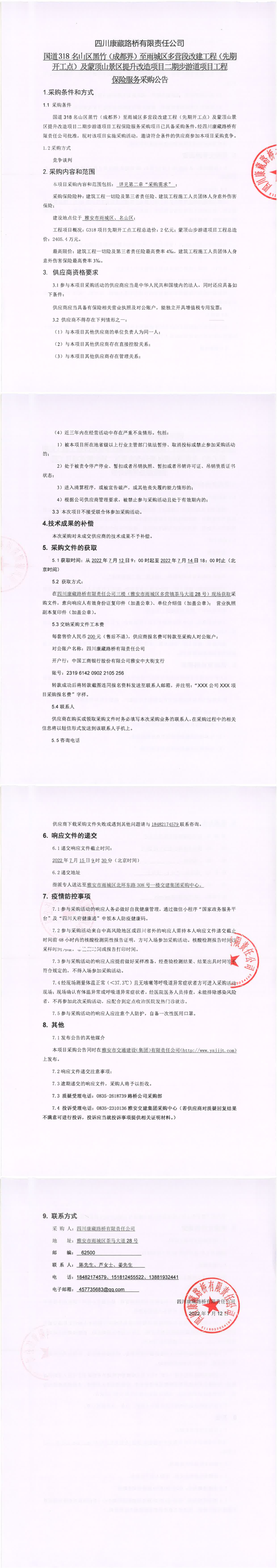 四川康藏路桥有限责任公司国道318名山区黑竹(成都界)至雨城区多营段改建工程(先期开工点)及蒙顶山景区提升改造项目二期步游道项目工程保险服务采购公告