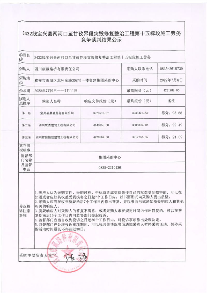 四川康藏路桥有限责任公司S432线宝兴县两河口至甘孜界段灾毁修复整治工程第十五标段施工劳务竞争谈判结果公示
