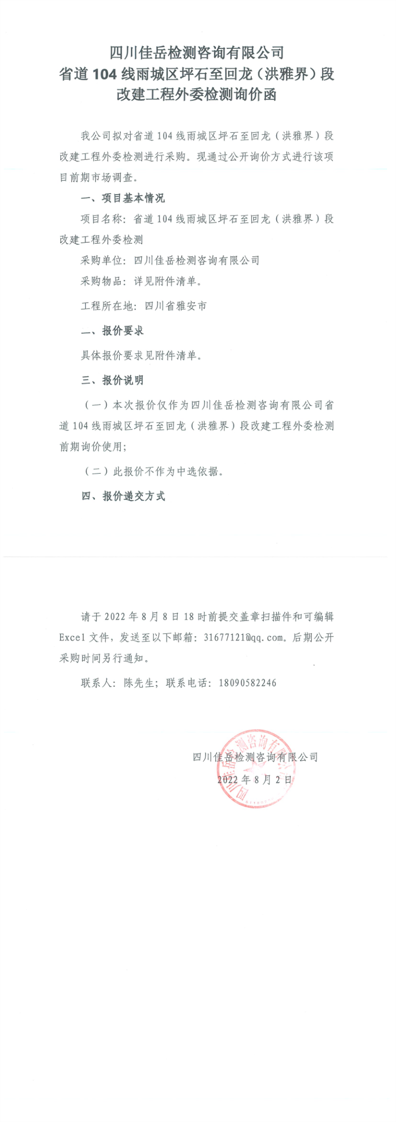 四川佳岳检测咨询有限公司省道104线雨城区坪石至回龙(洪雅界)段改建工程外委检测询价函