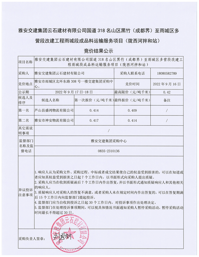 w66利来国际集团云石建材有限公司国道318名山区黑竹(成都界)至雨城区多营段改建工程雨城段成品料运输服务项目(陇西河拌和站)竞价结果公示