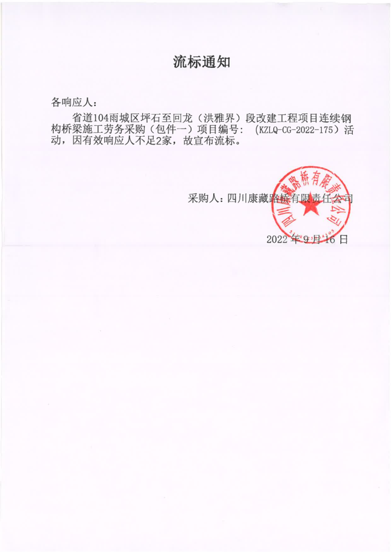四川康藏路桥有限责任公司省道104雨城区坪石至回龙(洪雅界)段改建工程项目陆续在钢构桥梁施工劳务采购(包件一)流标通知