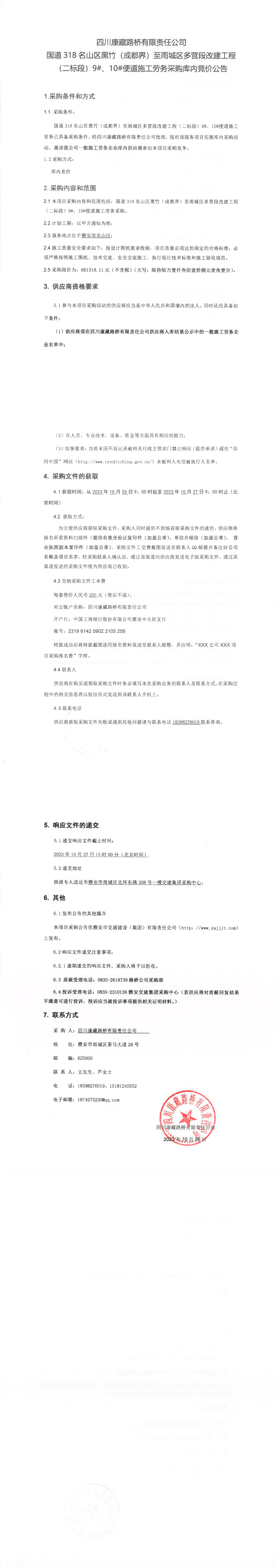 四川康藏路桥有限责任公司国道318名山区黑竹(成都界)至雨城区多营段改建工程(二标段)9#、10#便道施工劳务采购库内竞价公告