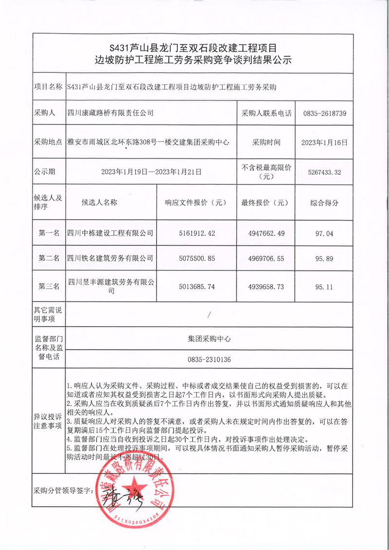 四川康藏路桥有限责任公司S431芦山县龙门至双石段改建工程项目边坡防护工程施工劳务采购竞争谈判结果公示