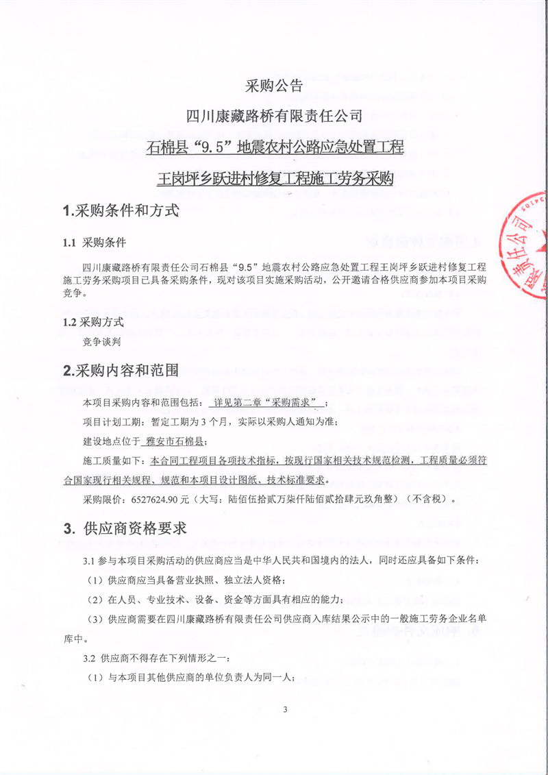 四川康藏路桥有限责任公司石棉县“9.5”地震农村公路应急处置工程王岗坪乡跃进村修复工程施工劳务采购公告