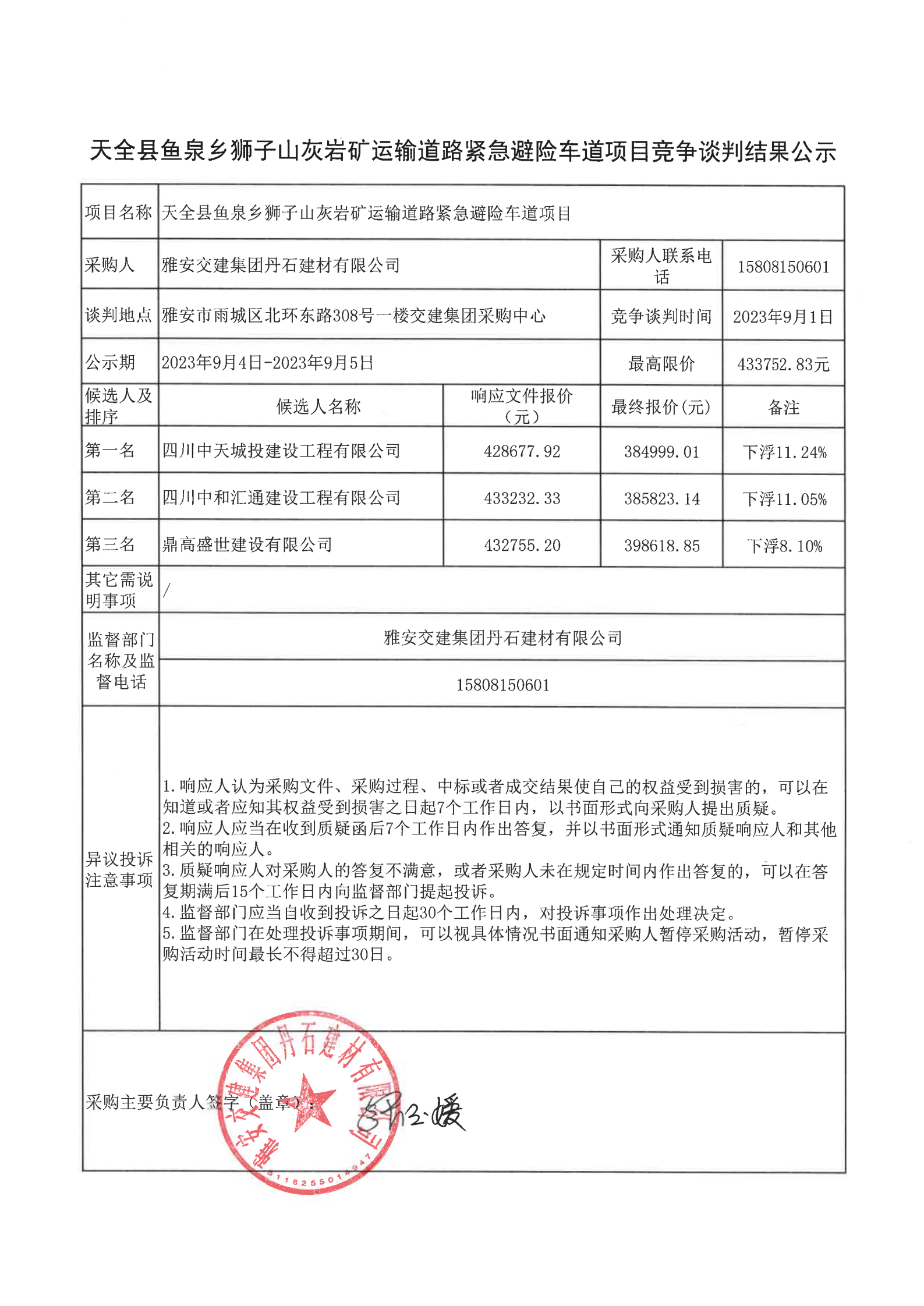 w66利来国际集团丹石建材有限公司天全县鱼泉乡狮子山灰岩矿运输道路紧急避险车道项目竞争谈判结果公示