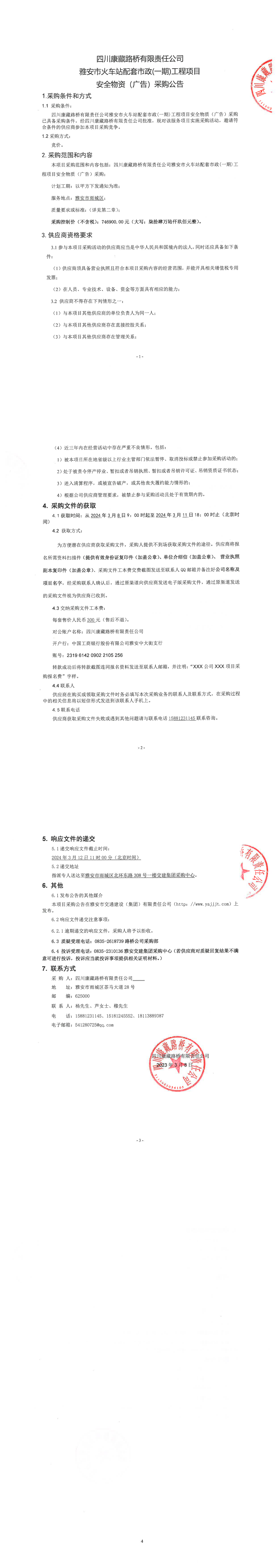 四川康藏路桥有限责任公司雅安市火车站配套市政(一期)工程项目安全物质(广告)采购公告