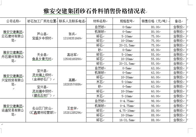 四、运通贸易有限公司。运通公司是雅安市交通建设(集团)有限责任公司独资子公司,主要负责雨城区中心城区河道外砂石经营管理工作。现在,公司与两家企业确定了代加工合作关系:一是名山区汇鑫建材经营部,该企业位于名山区门坎山,已投产;二是雅安市名山区双飞化工商贸有限公司该公司位于名山区马鞍山,已具备生产加工能力;预计年生产能力约80万吨。