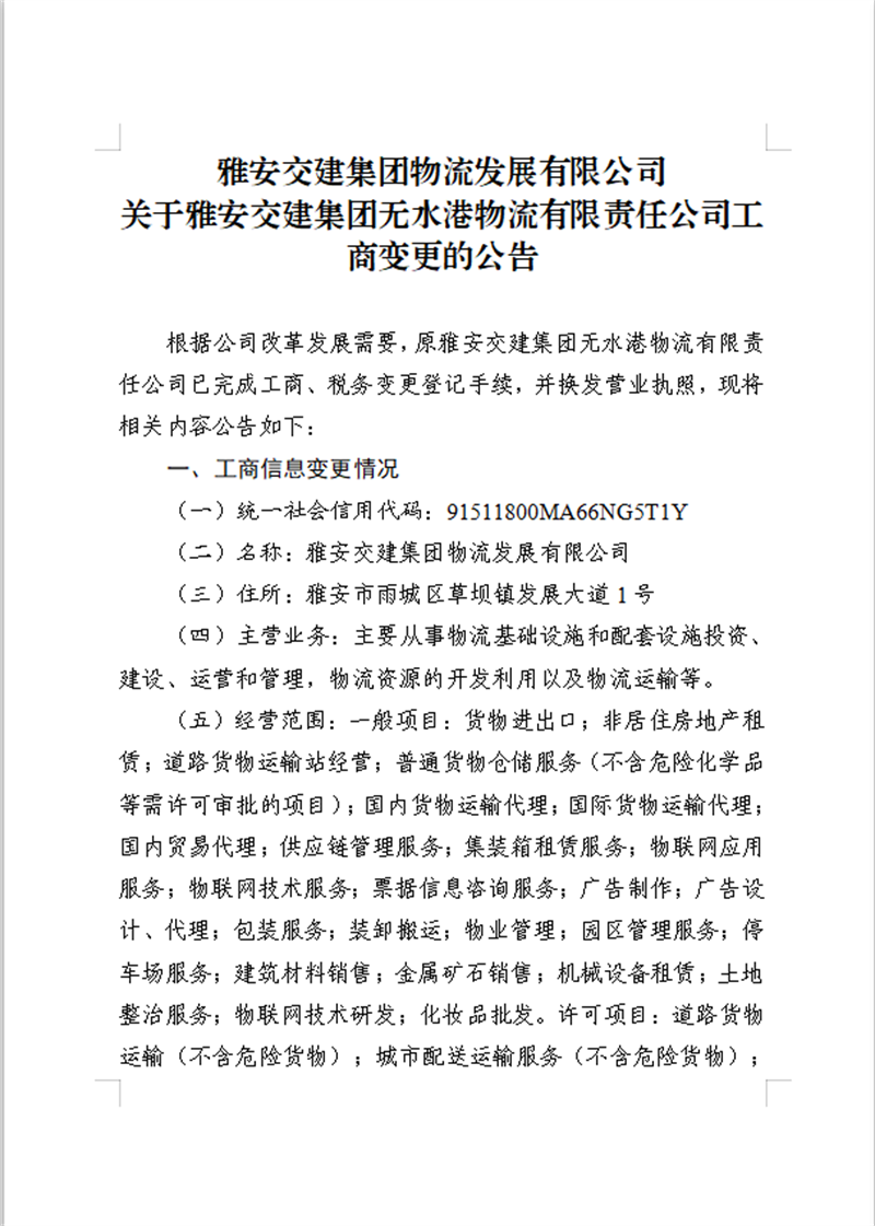 w66利来国际集团物流开展有限公司关于w66利来国际集团无水港物流有限责任公司工商变更的公告