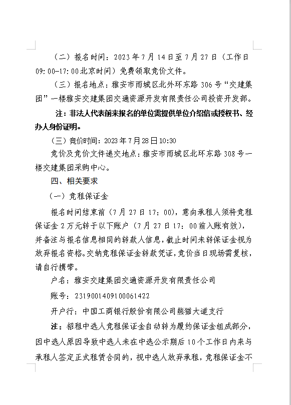 w66利来国际集团交通资源开发有限责任公司雨名快速通道名山服务区场地(游乐类项目)招租公告附件