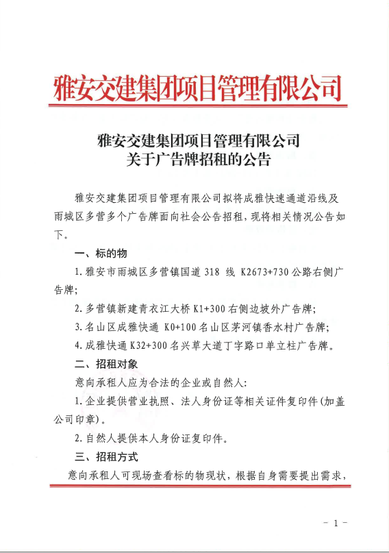 w66利来国际集团项目管理有限公司关于广告牌招租的公告