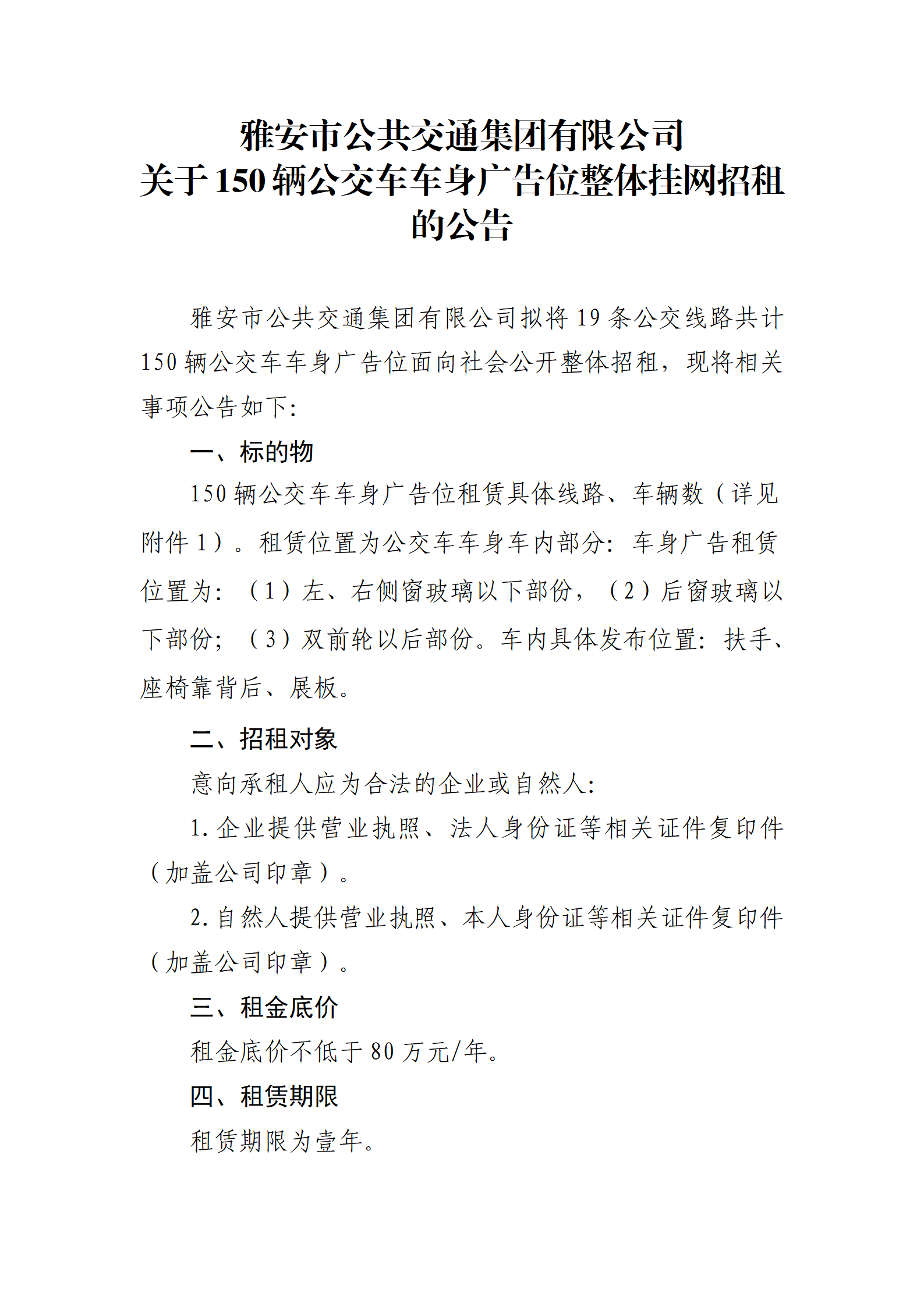 雅安市公共交通集团有限公司 关于150辆公交车车身广告位整体挂网招租的公告