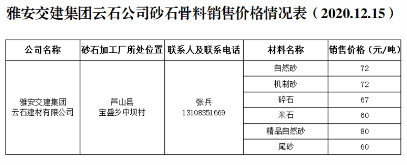 w66利来国际集团云石公司砂石骨料销售价格情况表(2020.12.15)