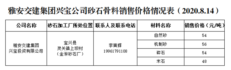 w66利来国际集团兴宝公司砂石骨料销售价格情况表(2020.8.14)