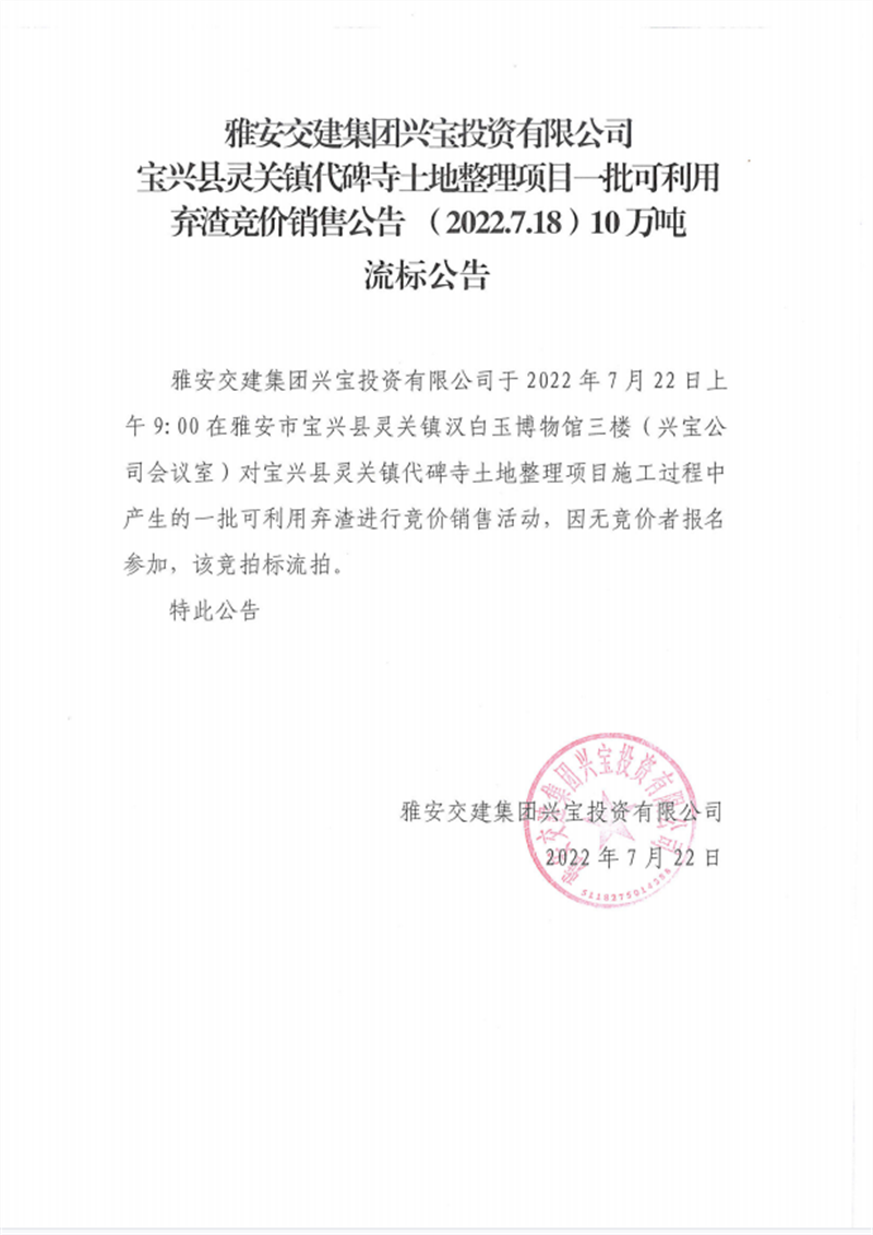 兴宝公司宝兴县灵关镇代碑寺土地整理项目10万吨可利用弃渣竞价销售挂网公告7.22(10万吨)
