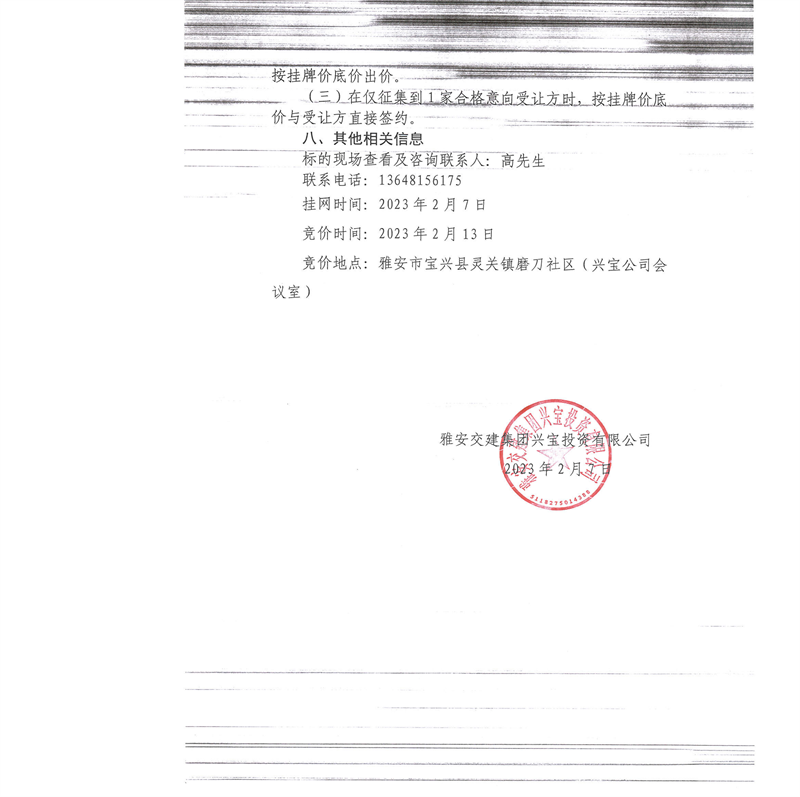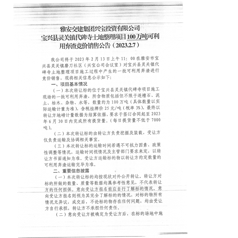 w66利来国际集团兴宝投资有限公司灵关镇代碑寺土地整理项目100万吨可利用弃渣竞价销售公告(2023.2.7)