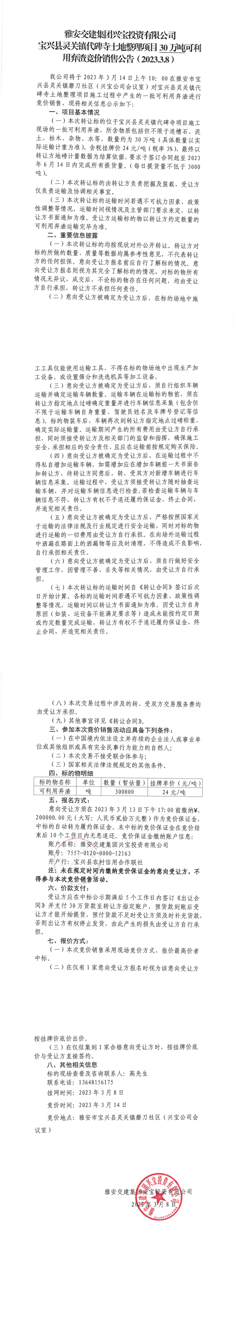 w66利来国际集团兴宝投资有限公司灵关镇代碑寺土地整理项目30万吨可利用弃渣竞价销售公告(2023.3.8)