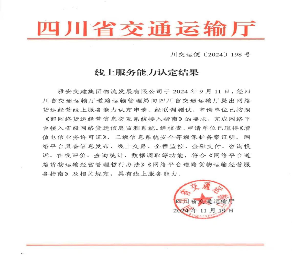 近期,《四川省交通运输厅线上服务能力认定结果》发布,w66利来国际集团物流开展有限公司正式取得网络货运经营线上服务能力认定,标志着雅安首家国企网络货运平台即将面向市场运营。